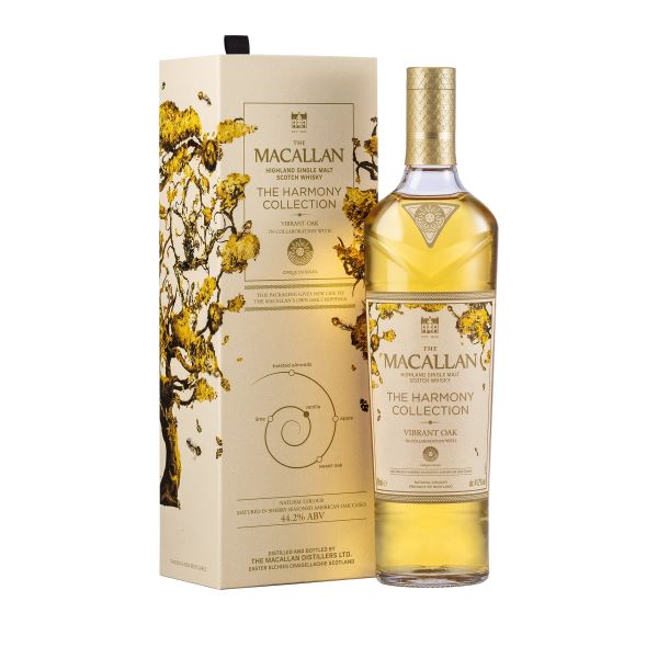 Harmony Collection là dòng whisky gắn kết với cam kết bảo vệ môi trường của Macallan, sử dụng vật liệu tái chế từ cà phê, cacao và gỗ. The Macallan Harmony Collection Vibrant Oak là tác phẩm mới nhất, vinh danh vẻ đẹp và linh hồn của gỗ sồi tự nhiên.